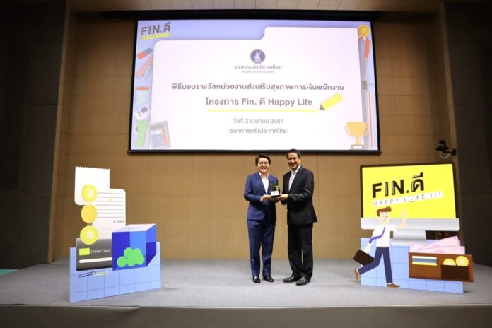 โดยได้รับเกียรติจาก นายรณดล นุ่มนนท์ รองผู้ว่าการด้านเสถียรภาพสถาบันการเงิน ธนาคารแห่งประเทศไทย (ธปท.) เป็นผู้มอบรางวัล ซึ่งโครงการดังกล่าวมีวัตถุประสงค์เพื่อสร้างภูมิคุ้มกันทางการเงินและสนับสนุนให้เกิดพฤติกรรมทางการเงินที่ดีของพนักงานในหน่วยงานผ่านวิทยากรทางการเงินประจำหน่วยงาน หรือ Fin. Trainer