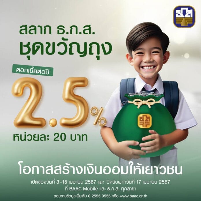 ธ.ก.ส. เปิดตัว “สลากออมทรัพย์ ธ.ก.ส. ชุดขวัญถุง” หนุนสร้างวินัยการออมเงินระยะยาวให้เด็กนักเรียนเพียงหน่วยละ 20 บาท จำนวน 100 ล้านหน่วย วงเงินรวม 2,000 ล้านบาท อายุรับฝาก 6 ปี เมื่อฝากครบกำหนดรับดอกเบี้ยทันที 2.50% ต่อปี พร้อมลุ้นรับทุนการศึกษาทุกงวด มูลค่า 10,000 บาท จำนวน 100 รางวัล และรางวัลพิเศษ ปีละ 2 ครั้ง ในเดือนมกราคมและเดือนกันยายน มูลค่ารางวัลละ 100,000 บาท จำนวน 12 รางวัล รวมมูลค่ารางวัล 73.2 ล้านบาท เปิดจองวันที่ 3 – 15 เมษายนนี้ ผ่านเคาน์เตอร์ ธ.ก.ส. ทุกสาขา ทั่วประเทศและแอปพลิเคชัน BAAC Mobile