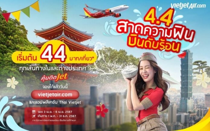 สายการบินไทยเวียตเจ็ทออกโปรโมชั่นฉลองวันดับเบิ้ลเดย์ “4.4 สาดความฟิน บินดับร้อน (4.4 Flash Sale)” เสนอบัตรโดยสารราคาพิเศษ เริ่มต้นเพียง 44 บาท (ราคาไม่รวมภาษีและค่าธรรมเนียม) สำหรับเดินทางบนเครือข่ายเส้นทางบินภายในประเทศและระหว่างประเทศของไทยเวียตเจ็ท สามารถสำรองบัตรโดยสารได้ระหว่างวันที่ 3 – 6 เมษายน 2567 ใช้เดินทางได้ระหว่างวันที่ 1 พฤษภาคม – 31 ธันวาคม 2567 (ยกเว้นวันหยุดนักขัตฤกษ์) ที่ www.vietjetair.com