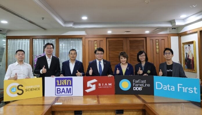 นายบัณฑิต อนันตมงคล ประธานเจ้าหน้าที่บริหาร ดร.ธนกร หวังพิพัฒน์วงศ์ รองประธานเจ้าหน้าที่บริหาร บริษัทบริหารสินทรัพย์ กรุงเทพพาณิชย์ จำกัด (มหาชน) หรือ BAM ลงนามบันทึกข้อตกลงความร่วมมือทางวิชาการ (MOU) ร่วมกับ ดร.พิชัย มงคลวานิช อธิการบดีมหาวิทยาลัยสยาม นายปริวรรต องค์ศุลี หัวหน้าภาควิชาวิทยาการคอมพิวเตอร์ นางเกษแก้ว อิทธิกุล กรรมการผู้จัดการ บริษัท ฟาร์อีสท์ เฟมไลน์ ดีดีบี จำกัด และนายทรงพล ยิ่งสุวรรณโชติ ผู้อำนวยการฝ่ายบริหารประสบการณ์ลูกค้า บริษัท ดาต้า เฟิร์ส จำกัด เพื่อร่วมมือกันสร้างโอกาสให้นักศึกษาได้พัฒนาในหลักสูตรการเรียน การสอนและแลกเปลี่ยนเรียนรู้ประสบการณ์ เพิ่มศักยภาพระหว่างบุคลากรของมหาวิทยาลัยและ BAM ได้เชื่อมโยงกิจกรรมทางการศึกษา ส่งเสริม พัฒนา สนับสนุนการศึกษาให้ยั่งยืนต่อไป