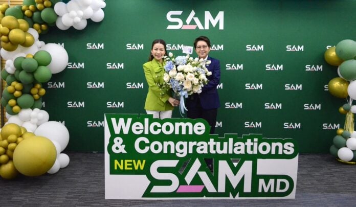 นางสาวนารถนารี รัฐปัตย์ กรรมการผู้จัดการ บริษัท บริหารสินทรัพย์สุขุมวิท จำกัด (บสส.) หรือ SAM ให้การต้อนรับ นางสาวศิรินันท์ ศิริพานิช ผู้ช่วยรัฐมนตรีประจำกระทรวงอุตสาหกรรม เนื่องในโอกาสแสดงความยินดีเข้ารับตำแหน่งกรรมการผู้จัดการคนใหม่ของ SAM