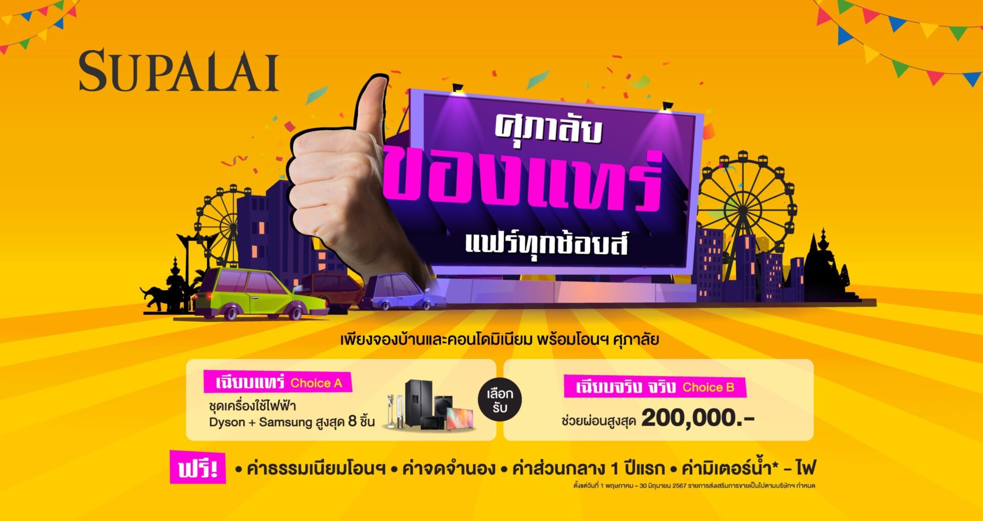 ให้คุณได้เป็นเจ้าของโครงการบ้าน และคอนโดมิเนียมพร้อมอยู่ในทำเลโดนใจกับโปรฯเด็ด “ศุภาลัย ของแทร่ แฟร์ทุกช้อยส์” ที่จัดหนักให้ ฟรี! ค่าธรรมเนียมโอนกรรมสิทธิ์, ค่าจดจำนอง, ค่าส่วนกลาง 1 ปีแรก และค่ามิเตอร์น้ำ* – ไฟ พร้อมของแถมสุดเฉียบกับช้อยส์แรก รับไปเลยชุดเครื่องใช้ไฟฟ้า Dyson + Samsung สูงสุด 8 ชิ้น* หรือช้อยส์ที่ 2 ช่วยผ่อนสูงสุด* 200,000 บาท ก็เฉียบไม่แพ้กัน (*เงื่อนไขเป็นไปตามที่บริษัทฯ กำหนด) ตั้งแต่วันที่ 1 พฤษภาคม – 30 มิถุนายนนี้ สำหรับลูกค้าที่สนใจโครงการบ้าน ทาวน์โฮม และคอนโดมิเนียมสร้างเสร็จพร้อมเข้าอยู่ สามารถเยี่ยมชมโครงการ ณ สำนักงานขายศุภาลัยทั่วประเทศ และสามารถตรวจสอบรายชื่อโครงการบ้าน ทาวน์โฮม และคอนโดมิเนียม ที่เข้าร่วมรายการได้ที่ www.supalai.com และ Facebook : Supalai หรือสอบถามข้อมูลเพิ่มเติมโทร. 1720