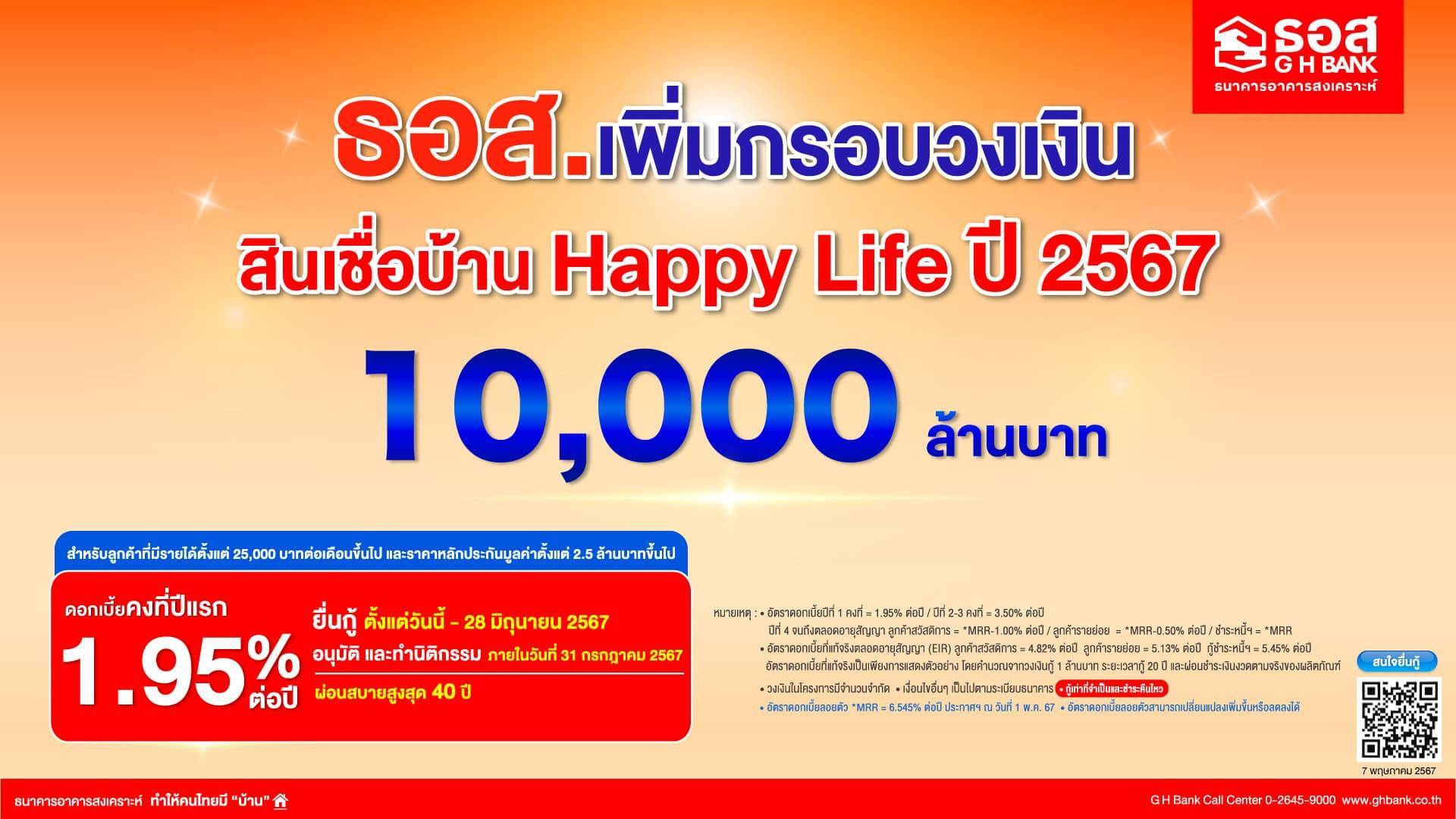 ของประชาชน ดำเนินการตามมาตรการกระตุ้นเศรษฐกิจ ผ่านภาคอสังหาริมทรัพย์ของรัฐบาล นายเศรษฐา ทวีสิน นายกรัฐมนตรี และตามนโยบายนายกฤษฏา จีนะวิจารณะ รัฐมนตรีช่วยว่าการกระทรวงการคลัง โดยเพิ่มกรอบวงเงินสินเชื่อ Happy Life อีก 10,000 ล้านบาท อัตราดอกเบี้ยปีที่ 1 คงที่เพียง 1.95% ต่อปี หลังได้รับ การตอบรับ ลูกค้าสนใจยื่นขอสินเชื่อเต็มกรอบวงเงิน 10,000 ล้านบาทแรกแล้ว โดยผู้ที่สนใจสามารถยื่นขอสินเชื่อ ณ สาขาธนาคารทั่วประเทศ ได้ตั้งแต่วันนี้ถึงวันที่ 28 มิถุนายน 2567 และทำนิติกรรมภายในวันที่ 31 กรกฎาคม 2567