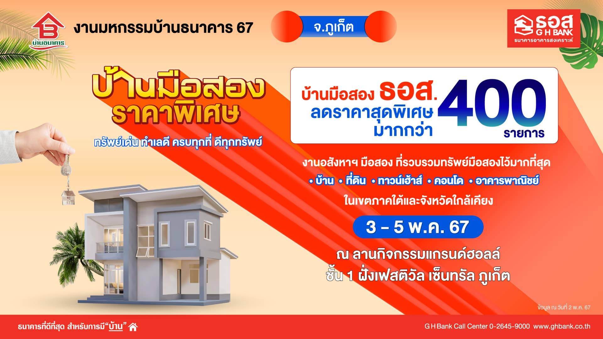 ธนาคารอาคารสงเคราะห์ (ธอส.) พร้อมสนับสนุนคนไทยให้มีที่อยู่อาศัยเป็นของตนเองเพิ่มขึ้น ด้วยการจัดงาน มหกรรมบ้านธนาคาร 67 จังหวัดภูเก็ต ระหว่างวันที่ 3-5 พฤษภาคม 2567 ณ ลานกิจกรรมแกรนด์ฮอลล์ ชั้น 1 ฝั่งเฟสติวัล เซ็นทรัล ภูเก็ต โดยภายในงาน ธอส. นำบ้านมือสองคุณภาพดี ทำเลเด่น และราคาคุ้มค่า ที่ตั้งอยู่ใน จ.ภูเก็ตและพื้นที่ใกล้เคียง มาจำหน่าย 495 รายการ ทั้งประเภทบ้านเดี่ยว บ้านแฝด ทาวน์เฮ้าส์ ห้องชุด (คอนโดมิเนียม) และอาคารพาณิชย์ พร้อมส่วนลดสูงสุด 50% จากราคาประเมิน โดยทรัพย์ที่น่าสนใจ ได้แก่ ทรัพย์ประเภทบ้านแฝด 2 ชั้น ขนาดเนื้อที่ 30.9 ตร.ว. ในโครงการหมู่บ้านลินลี่ วัลเลย์ อ.เมืองกระบี่ จ.กระบี่ มีราคาจำหน่ายอยู่ที่ 1.505 ล้านบาท เนื่องจากเป็นทรัพย์ที่ติดถนนหลัก เดินทางสะดวก และเหมาะแก่การอยู่อาศัย ทั้งนี้ ผู้ที่ลงทะเบียนจองซื้อทรัพย์ภายในงานมีโอกาสได้รับสินเชื่ออัตราดอกเบี้ยต่ำสุด นานสูงสุด 24 เดือน พิเศษ! สำหรับลูกค้าผู้ที่ซื้อทรัพย์และทำสัญญาจะซื้อจะขายภายใน 5 วันทำการ 20 รายแรก รับฟรีบัตรกำนัลแทนเงินสด มูลค่า 1,000 บาท (เงื่อนไขเป็นไปตามที่ธนาคารกำหนด) สอบถามข้อมูลเพิ่มเติมได้ที่ GH Bank Call Center โทร.0-2645-9000 กด 5 หรือ Facebook Fanpage บ้านมือสอง ธอส. หรือ ดูข้อมูลบ้านมือสอง ธอส.