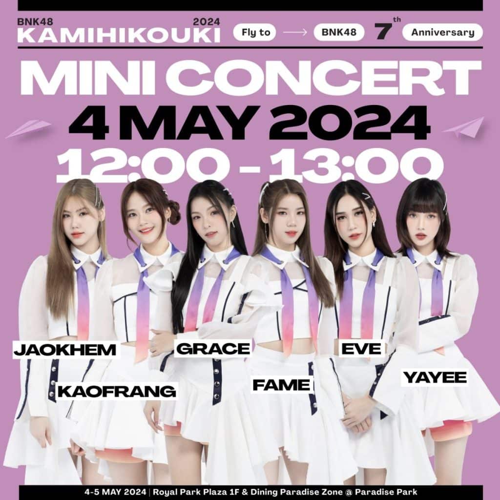 มาร่วมเก็บภาพความประทับใจ กับบรรยากาศที่เต็มไปด้วยความสุข ความอบอุ่น เป็นกันเองกับศิลปินเกิร์ลกรุ๊ป คนโปรดของคุณ ในงาน Fly to BNK48 7th Anniversary (BNK48 Kamihikouki 2024) ในวันเสาร์ที่ 4 และวันอาทิตย์ที่ 5 พฤษภาคม 2567 ตั้งแต่เวลา 12.00 น. – 21.00 น. ณ บริเวณชั้น 1 ลานรอยัลพาร์ค พลาซ่า และโซน Dining Paradise ศูนย์การค้าพาราไดซ์ พาร์ค หรือสอบถามรายละเอียด รูปแบบงานเพิ่มเติมได้ที่เฟซบุ๊กเพจ BNK48