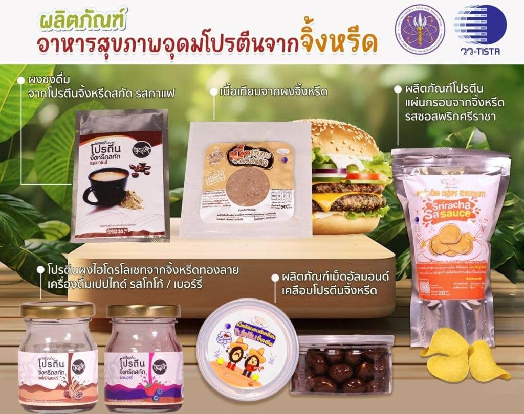 ดร.ชุติมา เอี่ยมโชติชวลิต ผู้ว่าการ วว. กล่าวว่า โปรตีนจากแมลง (Insect-based Protein) และพืช (Plant-based Protein) ได้รับความนิยมจากผู้บริโภคมากขึ้น ด้วยปัจจัยพื้นที่การผลิตอาหารของโลกที่มีแนวโน้มลดลง ขณะที่ความต้องการอาหารมีปริมาณมากขึ้น เนื่องจากประชากรโลกมีอายุยืนขึ้น ส่งผลให้นวัตกรรมด้านอาหารเป็นสิ่งจำเป็นและมีบทบาทมากขึ้นอย่างต่อเนื่อง ดังนั้น วว. จึงมุ่งนำเทรนด์อาหารแห่งอนาคตมาเป็นแนวทางดำเนินงานวิจัยและพัฒนาด้านอาหารเพื่อสุขภาพ เพื่อตอบโจทย์ความต้องการของผู้บริโภค และสนับสนุนให้ภาคอุตสาหกรรมอาหารของไทยนำผลงานวิจัยวิทยาศาสตร์ เทคโนโลยี และนวัตกรรม ไปใช้ประโยชน์ให้หลากหลายมากขึ้น สามารถตอบโจทย์ความต้องการของตลาดได้อย่างครบวงจร รวมทั้งสามารถบริหารจัดการคาร์บอนเครดิตได้มากขึ้น เนื่องจากกระบวนการผลิตแมลงจะใช้พื้นที่น้อย แมลงต้องการอาหารน้อยกว่าในการเจริญเติบโต และส่งผลกระทบต่อสิ่งแวดล้อมน้อยกว่าการผลิตสัตว์ประเภทอื่นๆ ทั้งนี้จากการดำเนินงานของ วว. ตามแนวทางดังกล่าว ประสบผลสำเร็จในการวิจัยและพัฒนาผลิตภัณฑ์ “อาหารสุขภาพอุดมโปรตีนจากจิ้งหรีด” โดยพร้อมถ่ายทอดเทคโนโลยีการผลิตให้กับผู้ประกอบการที่สนใจนำไปต่อยอดเชิงพาณิชย์ ดังนี้