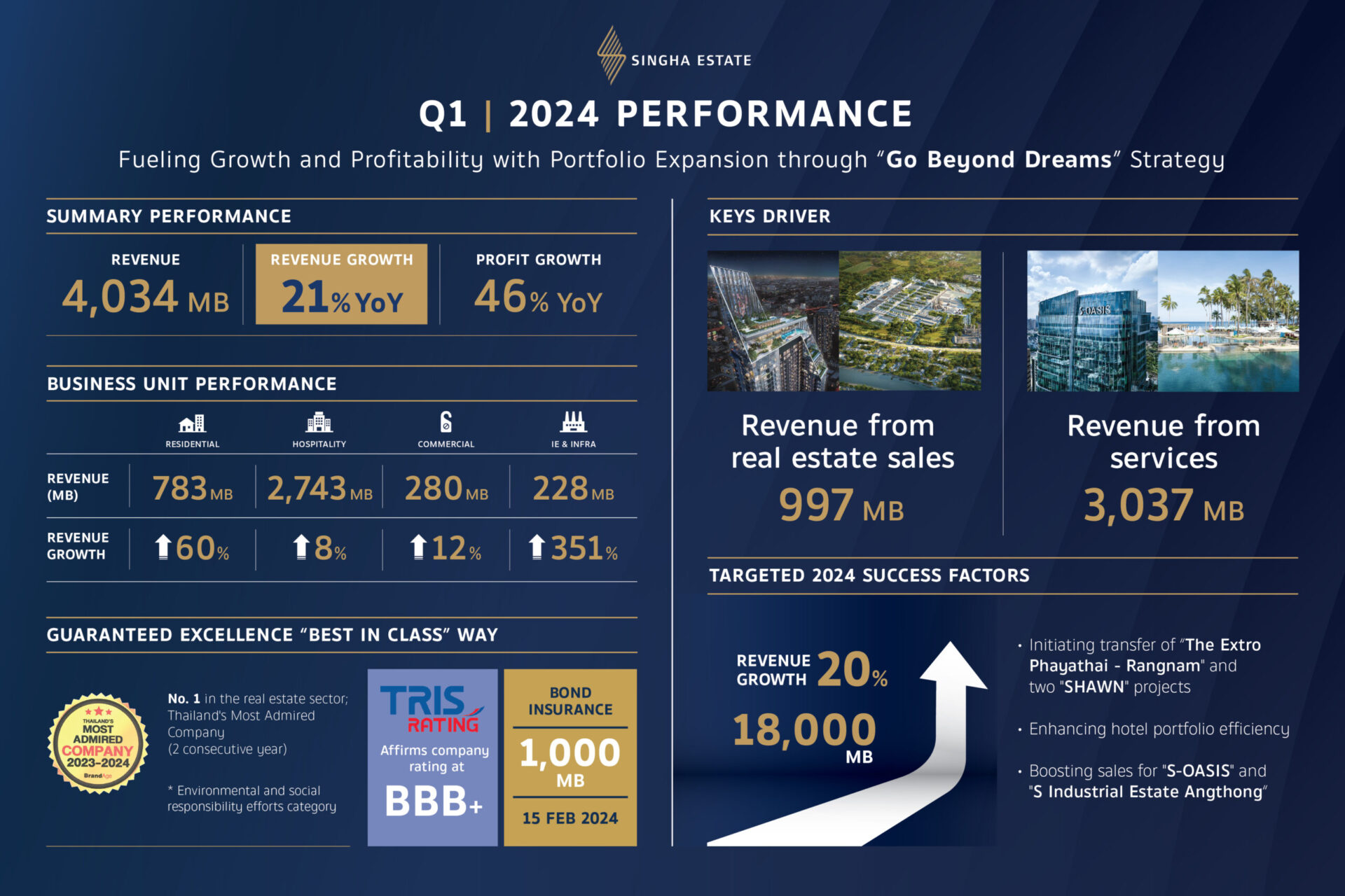 สิงห์ เอสเตท รายงานรายได้รวมจากการขายและการบริการสำหรับไตรมาส 1 ปี 2567 จำนวน 4,034 ล้านบาท เพิ่มขึ้น 21% YoY และกำไรสุทธิ จำนวน 104 ล้านบาท เพิ่มขึ้น 46% YoY ซึ่งเป็นผลมาจากการเติบโตของผลประกอบการในทุกกลุ่มธุรกิจ โดยเฉพาะความสำเร็จของการเปิดตัวโครงการที่พักอาศัยใหม่ที่ได้รับการตอบรับจากตลาดเป็นอย่างดี รวมถึงกลยุทธ์ของธุรกิจโรงแรมในการผลักดันอัตราค่าห้องพัก และรายได้ที่ไม่ใช่ห้องพักเพิ่มตามเป้าหมาย เพื่อชิงโอกาสจากกระแสการใช้จ่ายสำหรับการท่องเที่ยวที่มีแนวโน้มเพิ่มขึ้น พร้อมสร้างคุณค่าและการเติบโตอย่างยั่งยืน สอดคล้องตามแผนกลยุทธ์ที่ตั้งไว้