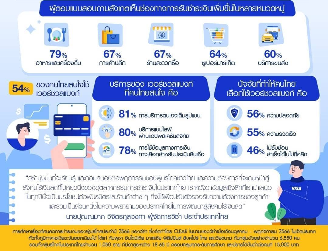 การศึกษาของวีซ่ายังชี้ให้เห็นถึงเทรนด์การใช้จ่ายแบบไร้เงินสดที่ยังคงเดินหน้าอย่างแข็งแกร่งในประเทศไทย โดยพบว่ามากถึงแปดในสิบของผู้บริโภค (81%) พยายามจะใช้จ่ายโดยไม่พึ่งพาเงินสด โดยผู้นำเทรนด์เป็นผู้บริโภคจากกลุ่มเจน Z (85%) [อายุระหว่าง 18 ถึง 23 ปี] และเจน Y (85%) [อายุระหว่าง 24 ถึง 39 ปี] นอกจากนี้ และเมื่อพูดถึงความสำเร็จในการใช้ชีวิตแบบไร้เงินสดก็พบว่าเกือบสี่ในห้าของชาวไทยสามารถทำได้จริงในชีวิตประจำวัน