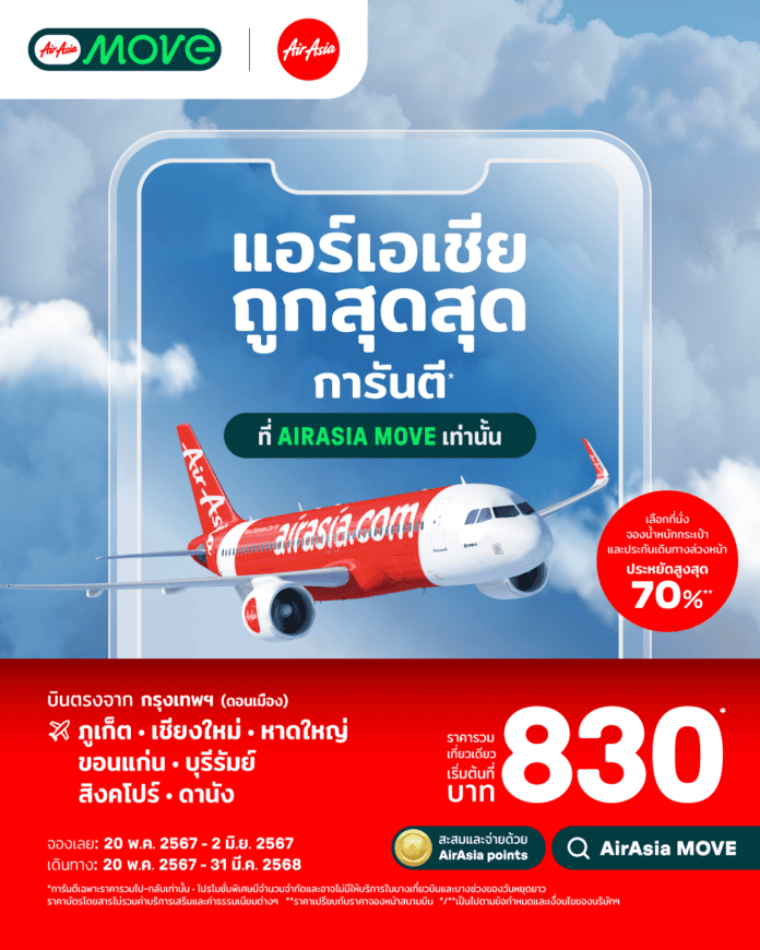 AirAsia MOVE ในฐานะแพลตฟอร์มการท่องเที่ยวออนไลน์ในกลุ่มแคปปิตอล เอ (Capital A) มุ่งเป็นเพื่อนร่วมทางที่ตอบโจทย์การท่องเที่ยวในภูมิภาค พร้อมมอบราคาตั๋วเครื่องบิน AirAsia ที่การันตีราคาถูกสุดสุดที่แอป AirAsia MOVE และ airasia.com จองเลย 20 พฤษภาคม – 2 มิถุนายน 2567 เดินทาง 20 พฤษภาคม – 31 มีนาคม 2568