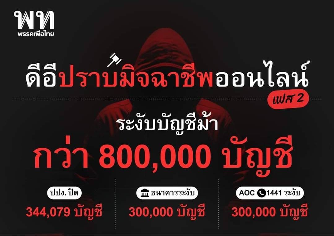 – ระงับบัญชีม้าแล้วกว่า 800,000 บัญชี แบ่งเป็น ปปง.ปิด 344,079 บัญชี ธนาคารระงับเอง 300,000 บัญชี และ AOC ระงับ 171,794 บัญชี