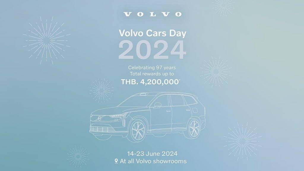 วอลโว่ คาร์ ประเทศไทย ฉลองครบรอบ 97 ปีแบรนด์ วอลโว่ (VOLVO) จัดกิจกรรม1 Volvo Cars Day มอบสิทธิประโยชน์สุดเอ็กซ์คลูซีฟแก่ลูกค้าที่สนใจเป็นเจ้าของรถวอลโว่ทั้งในรุ่น Pure Electric และ Plug-in Hybrid โดยกิจกรรมจัดขึ้นระหว่างวันที่ 14 – 23 มิถุนายน พ.ศ. 2567 โดยผู้สนใจสามารถเลือกรับข้อเสนอพิเศษ มูลค่ารวมสูงสุดถึง 500,000 บาท และสิทธิลุ้นรับ iPhone 15 Pro Max 256 GB จำนวน 97 เครื่อง มูลค่ารวมกว่า 4,200,000 บาท ณ โชว์รูมผู้จัดจำหน่ายรถวอลโว่ทั่วประเทศ