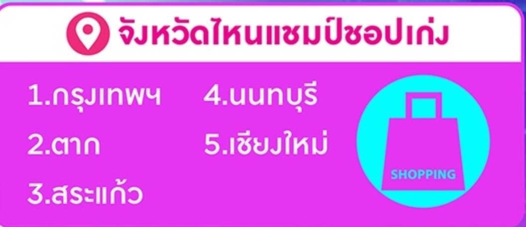 – นักชอปชาวกรุงเทพฯ ขึ้นแท่นครองแชมป์ชอปเก่งที่สุด ตามมาด้วยนักชอปในจังหวัด ตาก, สระแก้ว, นนทบุรี และเชียงใหม่ตามลำดับ