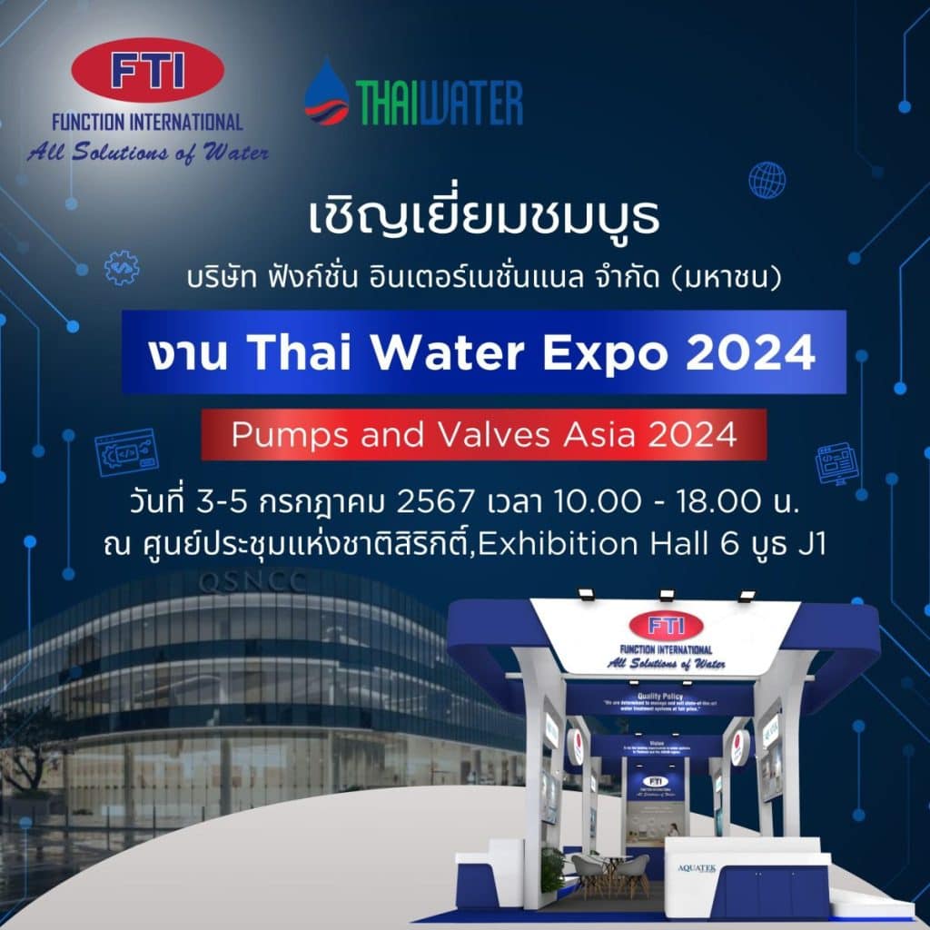 พร้อมจัดเต็ม! บมจ.ฟังก์ชั่น อินเตอร์เนชั่นแนล (FTI) ผู้ดำเนินธุรกิจเครื่องกรองน้ำและระบบน้ำแบบครบวงจร เตรียมยกทัพสินค้าคุณภาพแบบจัดเต็ม อาทิ เครื่องกรองน้ำ เครื่องกรอง RO 500 GPD AQUATEK-SILVER ตู้น้ำร้อน/เย็น AQUATEK ไส้กรอง ตู้น้ำหยอดเหรีญ Membrane Vontron และ ปั้ม CNP พร้อมโชว์ นวัตกรรม ในงาน “Thai Water Expo 2024” Pumps and Valves Asia 2024 นิทรรศการและการประชุมนานาชาติด้านเทคโนโลยีการจัดการทรัพยากรน้ำและน้ำเสียที่ครบวงจรที่สุดงานเดียวในประเทศไทย…ถ้าไม่อยากพลาดผลิตภัณฑ์ที่มีคุณภาพ มาพบกันได้ในวันที่ 3-5 กรกฎาคม 2567 เวลา 10.00 – 18.00 น. ณ Hall 6 บูธ J1 ศูนย์ประชุมแห่งชาติสิริกิติ์