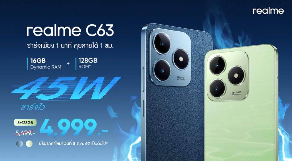 realme รู้ใจคนไทยที่ต้องรับมือกับสายฝน ประกาศปรับราคาสมาร์ตโฟนรุ่นคุ้มค่าแห่งปี “realme C63” จาก 5,499 บาท เหลือเพียง 4,999 บาท ชูฟีเจอร์สุดล้ำตอบโจทย์หน้าฝนอย่าง Rainwater Smart Touch ช่วยให้คุณใช้งานโทรศัพท์ได้อย่างต่อเนื่อง ทั้งควบคุมและสั่งงานผ่านจอแสดงผลได้อย่างสะดวกสบายและแม่นยำ ไม่ว่าจะอยู่กลางสายฝน หลังล้างมือ หรือในขณะมือชุ่มเหงื่อจากการออกกำลังกาย พร้อมให้คุณจับจองในราคาใหม่กันได้ตั้งแต่วันที่ 8 กรกฎาคม เป็นต้นไป ทั้งในแพลตฟอร์มออนไลน์และศูนย์จำหน่ายชั้นนำ รวมถึง realme Brand Shop ทุกสาขาทั่วประเทศ