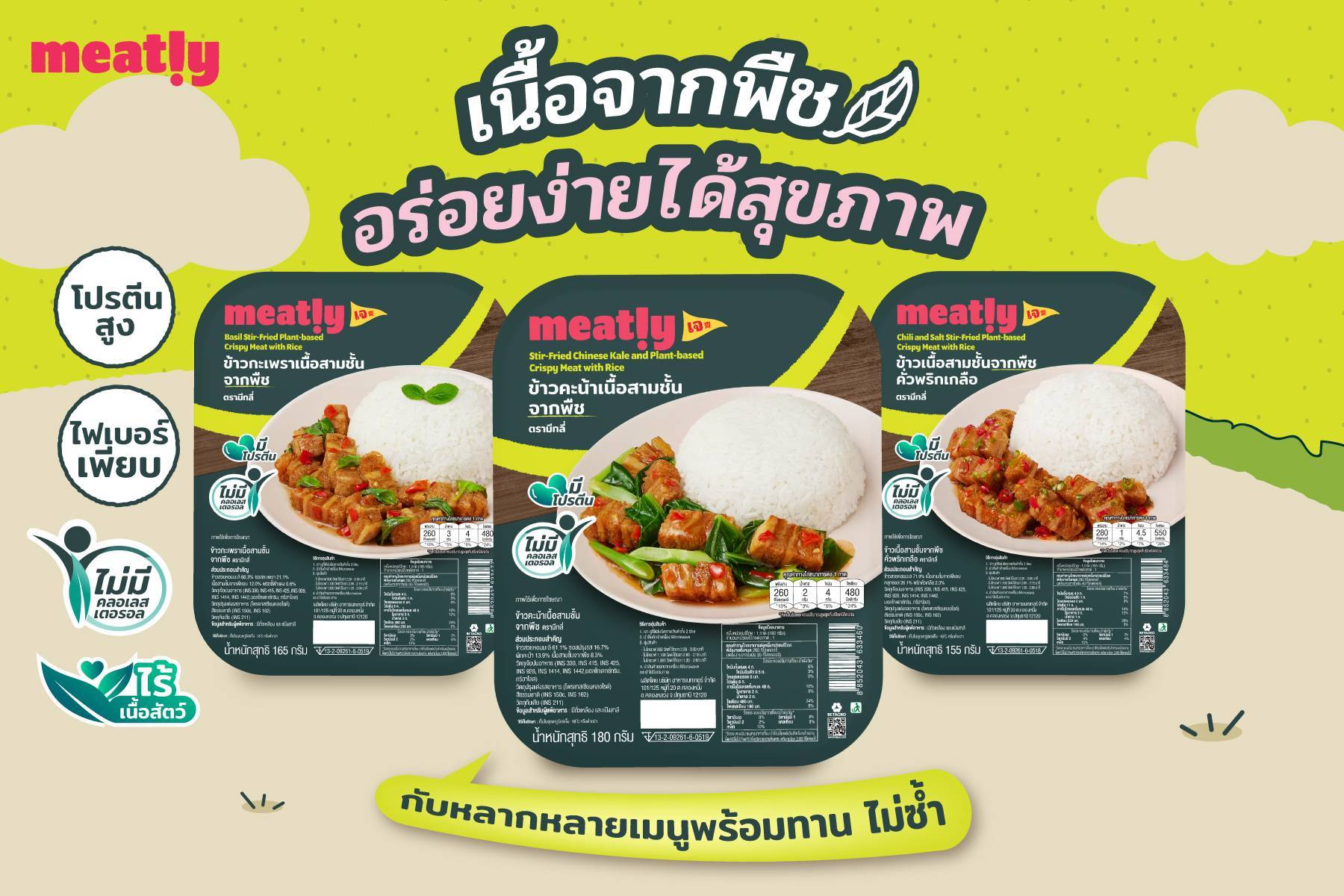 นางสาววรลัญจ์ แต้ไพสิฐพงษ์ ผู้บริหารโครงการ Meatly! กล่าวว่า Meatly! แพลนต์เบสฟู้ดพรีเมียม มุ่งนำเสนอผลิตภัณฑ์อาหารที่หลากหลายครอบคลุมทั้งอาหารพร้อมปรุง (Ready to cook) และอาหารพร้อมทาน (Ready to eat) ทั้งเมนูอาหารไทย และอาหารนานาชาติ เพื่อตอบโจทย์พฤติกรรมผู้บริโภคที่ใส่ใจสุขภาพ ต้องการความหลากหลาย และสะดวกสบายเหมาะกับไลฟ์สไตล์ที่เร่งรีบ โดยล่าสุดได้มีการเปิดตัว 3 เมนูสุดอร่อย ชูจุดเด่นอาหารต้นตำรับเนื้อจากพืช ภายใต้คอนเซ็ปต์ “เนื้อจากพืช อร่อยง่ายได้สุขภาพ” ด้วยแพคเกจจิ้งที่ทันสมัย ชวนทุกคนสัมผัสกับเนื้อสามชั้นที่กลิ่นมีความใกล้เคียงเนื้อสัตว์ ไม่ต่างกับเนื้อแท้ ๆ พร้อมคุณค่าทางโภชนาการที่มีโปรตีนและไฟเบอร์สูง ได้แก่ 1) ข้าวกระเพราเนื้อสามชั้น 2) ข้าวคะน้าเนื้อสามชั้น และ 3) ข้าวเนื้อสามชั้นผัดพริก