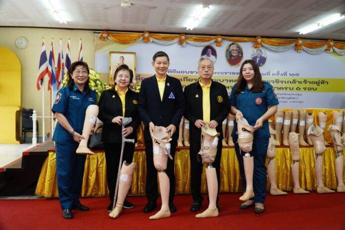 พร้อมด้วยเครื่องอุปโภคบริโภค ประกอบด้วย ข้าวสาร เส้นหมี่ขาว น้ำมันพืช หน้ากากอนามัย ร่ม สบู่ บรรจุถุงผ้าดิบ ให้แก่ผู้รับขาเทียม ช่างและอาสาสมัคร ที่เข้าร่วมโครงการออกหน่วยทำขาเทียมพระราชทานเคลื่อนที่ ครั้งที่ 169 เพื่อเฉลิมพระเกียรติพระบาทสมเด็จพระวชิรเกล้าเจ้าอยู่หัว เนื่องในโอกาสวันเฉลิมพระชนมพรรษาครบ 6 รอบ รวมจำนวน 150 คน รวมงบประมาณทั้งสิ้น 104,210 บาท (หนึ่งแสนสี่พันสองร้อยสิบบาทถ้วน) โดยมี ศาสตราจารย์เกียรติคุณ นายแพทย์เกษม วัฒนชัย องคมนตรี และประธานมูลนิธิขาเทียม ในสมเด็จพระศรีนครินทราบรมราชชนนี เป็นประธานในพิธี พร้อมด้วย นายสุรศักดิ์ เจริญศิริโชติ ผู้ว่าราชการจังหวัดนครปฐม ผู้แทนพระเดชพระคุณพระพรหมเวที เจ้าอาวาสพระอารามหลวงวัดพระปฐมเจดีย์ราชวรมหาวิหาร และผู้แทนจากหน่วยงานภาครัฐและเอกชนต่างๆ ร่วมในพิธี ณ ศาลากองอำนวยการองค์พระปฐมเจดีย์ วัดพระปฐมเจดีย์ราชวรมหาวิหาร อำเภอเมืองจังหวัดนครปฐม