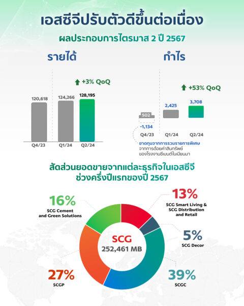 นายธรรมศักดิ์ เศรษฐอุดม กรรมการผู้จัดการใหญ่ เอสซีจี เปิดเผยว่า “ผลประกอบการเอสซีจีในไตรมาส 2 ปี 2567 ปรับตัวดีขึ้นจากไตรมาสที่ผ่านมา จากปริมาณขายที่เพิ่มขึ้นของเอสซีจี เคมิคอลส์ กำลังซื้อในตลาดอาเซียนดีขึ้น โดยเฉพาะเวียดนามและอินโดนีเซีย รวมทั้งมีรายได้เงินปันผลรับจากการลงทุนในธุรกิจอื่น ส่งผลให้มีรายได้ 128,195 ล้านบาท เพิ่มขึ้นร้อยละ 3 จากไตรมาสก่อน กำไรสำหรับงวด 3,708 ล้านบาท เพิ่มขึ้นร้อยละ 53 จากไตรมาสก่อน ขณะที่ครึ่งปีแรกของปี 2567 มีรายได้ 252,461 ล้านบาท ใกล้เคียงกับปีก่อน โดยมีสัดส่วนยอดขายจากเอสซีจี เคมิคอลส์ ร้อยละ 39 เอสซีจีพี ร้อยละ 27 เอสซีจี ซีเมนต์แอนด์กรีนโซลูชัน ร้อยละ 16 เอสซีจี สมาร์ทลีฟวิงและเอสซีจี ดิสทริบิวชั่นแอนด์รีเทล ร้อยละ 13 และเอสซีจี เดคคอร์ ร้อยละ 5