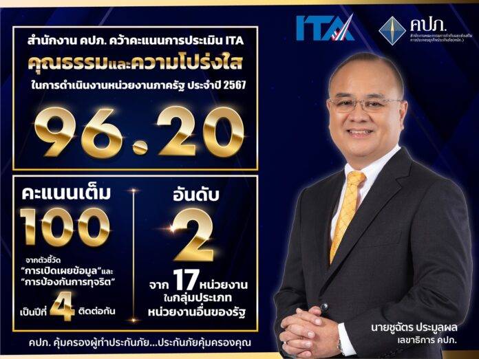 ทั้งนี้ ด้วยความมุ่งมั่นทุ่มเทของทุกคนในองค์กรที่ร่วมกันยกระดับคุณธรรมและความโปร่งใสในการดำเนินงาน ส่งผลให้ปีนี้ สำนักงาน คปภ. ได้รับคะแนนที่ 96.20 คะแนน ในระดับ ผ่านดี ซึ่งเป็นความภาคภูมิใจของสำนักงาน คปภ. ที่นอกจากจะแสดงให้เห็นถึงความร่วมแรงร่วมใจในการขับเคลื่อนพันธกิจขององค์กรอย่างมีประสิทธิภาพและเป็นธรรมแล้ว สำนักงาน คปภ. ยังให้ความสำคัญกับการมีส่วนร่วมของทุกภาคส่วนอย่างทั่วถึง การดำเนินงานอย่างโปร่งใสตรวจสอบได้ในทุกกระบวนการ และการปลูกฝังวัฒนธรรมองค์กรด้านคุณธรรมและความโปร่งใสในการดำเนินงานของสำนักงาน คปภ. ด้วยการมุ่งเน้นการมีส่วนร่วมของบุคลากรทุกระดับ ผ่านการประกาศเจตจำนงสุจริต การกำหนดนโยบายและมาตรการด้านคุณธรรมและความโปร่งใส การจัดทำแนวปฏิบัติ การประชาสัมพันธ์ให้ความรู้อย่างต่อเนื่อง และการแต่งตั้ง ITA Agent ประจำทุกสายงาน เพื่อสื่อสารและเผยแพร่ข้อมูลเกี่ยวกับการส่งเสริมคุณธรรมและความโปร่งใสขององค์กรอย่างเป็นระบบเพื่อให้บรรลุเป้าหมายในการก้าวสู่การเป็นองค์กรที่เป็นเลิศในทุกด้านโดยเร็ว