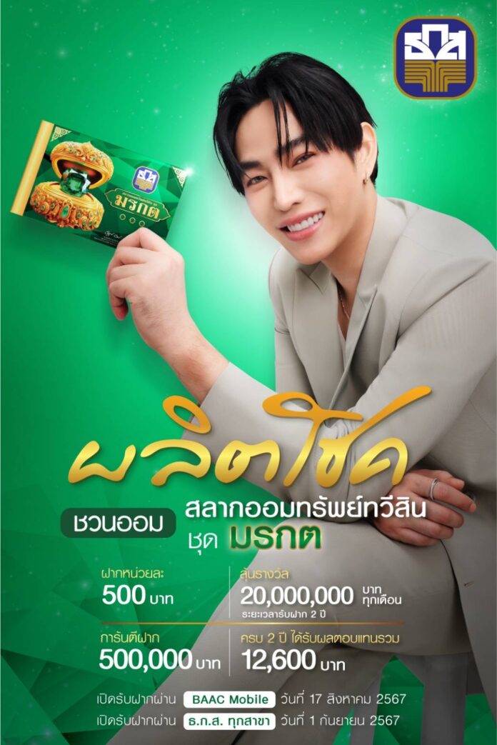 ธ.ก.ส. ชวนออมแบบรวยเหลือแจกไปกับสลากออมทรัพย์ทวีสิน ชุดมรกต หน่วยละ 500 บาท วงเงินรวม 1.5 แสนล้านบาท มอบโชคใหญ่ทุกเดือน มูลค่า 20 ล้านบาท และรางวัลอื่นๆ รวมมูลค่า 159 ล้านบาท จำนวน 24 ครั้ง ฝากครบรับผลตอบแทน ร้อยละ 0.30 ต่อปี เปิดรับฝากผ่านแอปพลิเคชัน BAAC Mobile 17 ส.ค. และที่เคาน์เตอร์ ธ.ก.ส. ทุกสาขา 1 ก.ย. นี้
