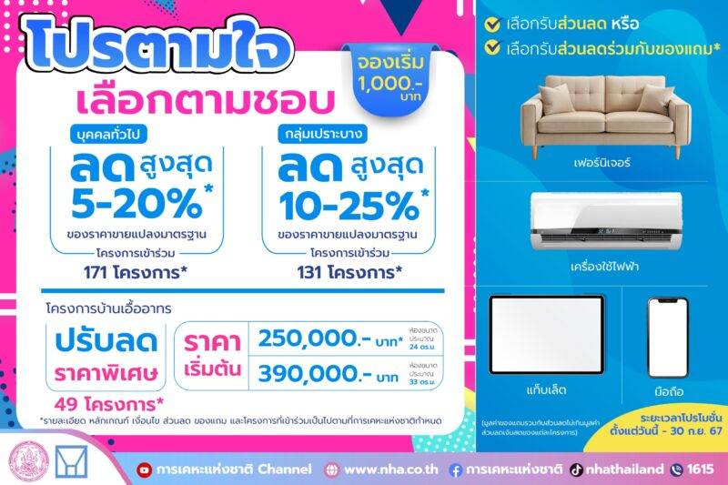 การเคหะแห่งชาติตามใจคนอยากมีบ้าน ยกทัพขายโครงการที่อยู่อาศัยทุกทำเลทั่วประเทศ จัดโปรโมชัน ตามใจเลือกตามชอบ มอบส่วนลดสูงสุด 25% พร้อมของแถมให้เลือกจุใจ ทำสัญญาวางเงินจองเริ่มต้นเพียง 1,000 บาท ตั้งแต่วันนี้ ถึงวันที่ 30 กันยายน 2567