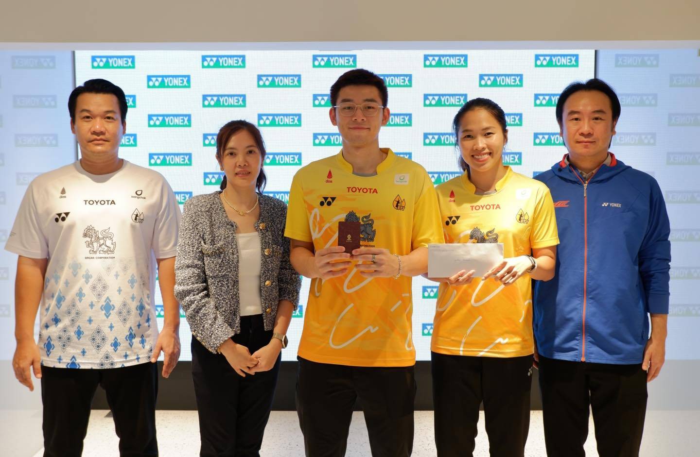 YonexThailand มอบทองแท่ง 5 บาท และเงินโบนัสกับฮีโร่เหรียญเงิน วิว กุลวุฒิ วิทิตศานต์ พร้อมด้วย เมย์ รัชนก อินทนนท์ และโค้ชเป้ ภัททพล