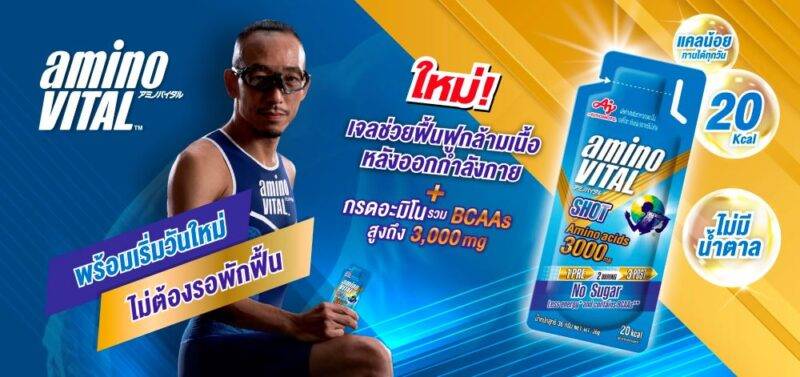 คุณวันนเรศวร์ สุขีลักษณ์ ผู้จัดการฝ่ายธุรกิจใหม่ บริษัท อายิโนะโมะโต๊ะ (ประเทศไทย) จำกัด กล่าวว่า เปิดตัวนวัตกรรมผลิตภัณฑ์เสริมอาหารกรดอะมิโนตัวใหม่ ภายใต้แบรนด์ aminoVITAL® Blue Shot เจลฟื้นฟูกล้ามเนื้อขนาดเล็กพกพาสะดวก พลังงานเพียง 20 Kcal ไม่มีน้ำตาลและมีส่วนประกอบของกรดอะมิโนรวม 3,000 มก. ช่วยเสริมประสิทธิภาพในการออกกำลังกาย และฟื้นฟูกล้ามเนื้อได้ทันทีหลังออกกำลังกาย โดดเด่นด้วย AminoScience ซึ่งกลุ่มบริษัทอายิโนะโมะโต๊ะ มีความเชี่ยวชาญเป็นอย่างดี