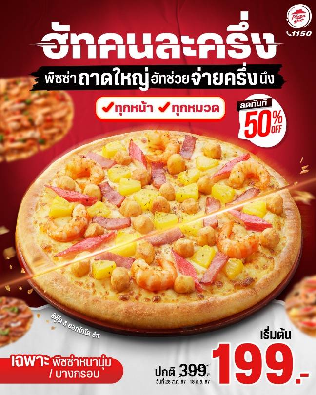พิซซ่า ฮัท 1150 แบรนด์พิซซ่าระดับโลกภายใต้การบริหารงานของบริษัท พีเอช แคปปิตอล จำกัด จัดแคมเปญ “ฮัทคนละครึ่ง” โปรคุ้มค่าที่สุด เพื่อให้ลูกค้าได้อิ่มอร่อยจุใจยิ่งขึ้น เพียงแค่ลูกค้าสั่งพิซซ่าถาดใหญ่ หนานุ่มหรือบางกรอบ รับส่วนลดไปทันที 50% ไม่ว่าจะเป็น หมวดเลิฟเวอร์ หมวดดีลักซ์ หมวดสุพรีม หมวดซีฟู้ด และพิเศษใหม่ อย่างพิซซ่า The Edge มาร่วมโปรโมชั่นด้วย ราคาเริ่มต้นเพียง 199 บาท (จากปกติ 399 บาท) เริ่มตั้งแต่วันที่ 28 สิงหาคม – 18 กันยายน 2567