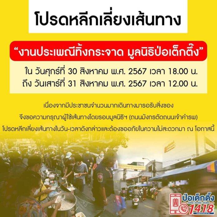 โปรดหลีกเลี่ยงเส้นทาง “งานประเพณีทิ้งกระจาด มูลนิธิป่อเต็กตึ๊ง” ในวันศุกร์ที่ 30 สิงหาคม พ.ศ. 2567 เวลา 18.00 น. ถึง วันเสาร์ที่ 31 สิงหาคม พ.ศ. 2567 เวลา 12.00 น.