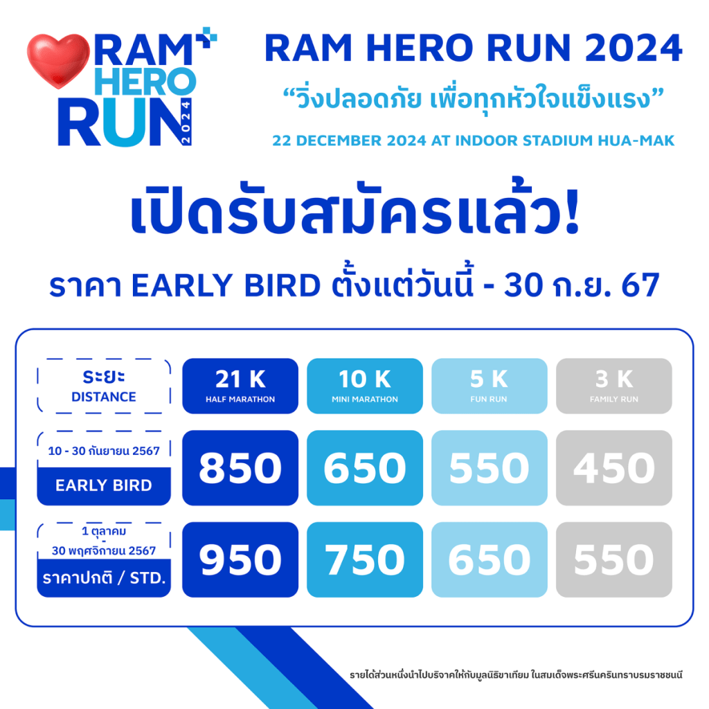 ติดตามรายละเอียดเพิ่มเติมได้ที่ Facebook : RAM HERO RUN สอบถามเกี่ยวกับการสมัคร (รันลา) Facebook : m.me/RunLahสอบถามข้อมูลเพิ่มเติม Call Center 1512 Line Official : @ramhospital