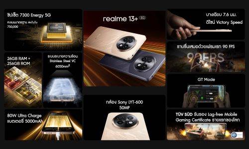 เกมมิ่งสมาร์ตโฟนตัวแรงแห่งปี! วันนี้ realme (เรียลมี) แบรนด์สมาร์ตโฟนเพื่อคนรุ่นใหม่ที่เติบโตเร็วที่สุดในโลก เปิดตัว “realme 13 Series 5G” สมาร์ตโฟนรุ่นล่าสุดจากตระกูล Number Series ในประเทศไทยอย่างเป็นทางการ พร้อมขึ้นแท่น ผู้นำด้านเกมมิ่งสมาร์ตโฟน (Gaming Dominator)” ด้วยการอัปเกรดประสิทธิภาพขั้นสุดระดับ อัลตร้าทั้ง 3 ด้าน ได้แก่ ULTRA POWER ด้วยซีพียูตัวท็อปของเซกเมนต์ ULTRA FAST ระบบชาร์จเร็วทันใจ ULTRA COOL ระบบระบายความร้อนใหม่ล่าสุด เมื่อผสานการทำงานจะมอบประสบการณ์สมาร์ตโฟนอันยอดเยี่ยม ทั้งการใช้งานแนวไลฟ์สไตล์ในชีวิตประจำวัน และการเล่นเกมออนไลน์อันหนักหน่วง ด้วยประสิทธิภาพการทำงานที่เร็วแรง ลื่นไหลขั้นสุด และปราศจากปัญหาความร้อนกวนใจ การันตีด้วยสโลแกน Speed to Victory ที่พร้อมให้คุณเป็นผู้ชนะในทุกเกมการแข่งขันโดย “realme 13 Series 5G” นำเสนอ 2 รุ่น ทั้ง “realme 13+ 5G” และ “realme 13 5G”