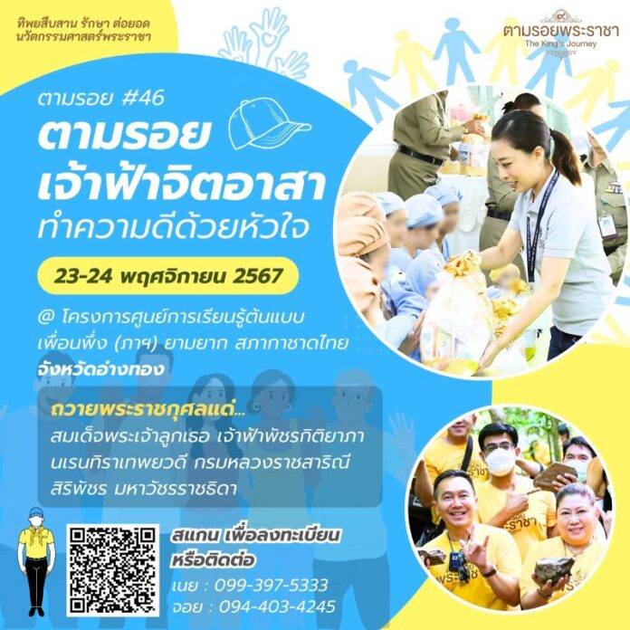 เชิญร่วมโครงการทิพยสืบสาน รักษา ต่อยอด นวัตกรรมศาสตร์พระราชา ครั้งที่ 46 ในวันที่ 23 – 24 พฤศจิกายน 2567 ณ โครงการศูนย์การเรียนรู้ต้นแบบเพื่อนพึ่ง (ภาฯ) ยามยาก สภากาชาดไทย บ้านทุ่งอ่างทอง จังหวัดอ่างทอง เปิดรับสมัครตั้งแต่วันนี้เป็นต้นไป สอบถามข้อมูลเพิ่มเติมที่ คุณจารุกัญญ์ โทรศัพท์ 099 397 5333 FB: ตามรอยพระราชา-The King’s Journey