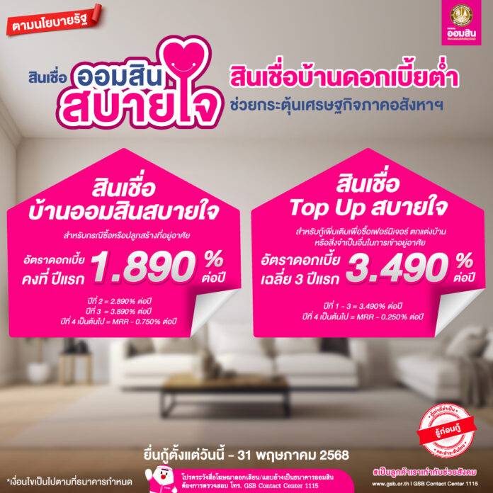 นายวิทัย รัตนากร ผู้อำนวยการธนาคารออมสิน เปิดเผยว่า ตามที่คณะรัฐมนตรีมีมติเมื่อวันที่ 12 พฤศจิกายน 2567 เห็นชอบมาตรการกระตุ้นเศรษฐกิจผ่านภาคอสังหาริมทรัพย์ ซึ่งเป็นความห่วงใยของรัฐบาลที่ต้องการแบ่งเบาภาระด้านดอกเบี้ยที่อยู่อาศัยของประชาชน รวมถึงส่งเสริมการมีที่อยู่อาศัยเป็นของตนเองของผู้มีรายได้ปานกลางที่มีแนวโน้มเพิ่มสูงขึ้นได้อย่างเพียงพอ ธนาคารจึงออกมาตรการสินเชื่อเพื่อเพิ่มโอกาสให้ประชาชนเข้าถึงสินเชื่อที่อยู่อาศัยดอกเบี้ยต่ำ ประกอบด้วย สินเชื่อบ้านออมสินสบายใจ ดอกเบี้ยเฉลี่ย 3 ปีแรก 2.890% ต่อปี สำหรับการซื้อหรือปลูกสร้างที่อยู่อาศัย วงเงินกู้ตั้งแต่ 3,000,000 – 7,000,000 บาท และ สินเชื่อ Top Up สบายใจ สำหรับผู้ที่ต้องการสินเชื่อเพิ่มเติมเพื่อการตกแต่งหรือดำเนินการอื่น ๆ ที่เป็นประโยชน์ต่อการอยู่อาศัย หรือการใช้จ่ายอเนกประสงค์ เช่น การซื้อเฟอร์นิเจอร์ เป็นต้น ดอกเบี้ยเฉลี่ย 3 ปี แรก 3.490% ต่อปี