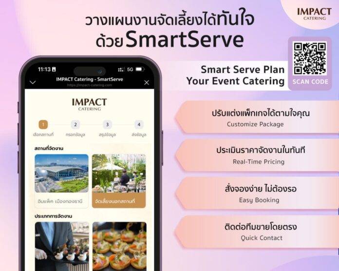 ด้วยความมุ่งมั่นพร้อมให้บริการลูกค้าอย่างดีที่สุด อิมแพ็ค เคเทอริ่ง บริการจัดเลี้ยงคุณภาพและครบวงจร โดย บริษัท อิมแพ็ค เอ็กซิบิชั่น แมเนจเม้นท์ จำกัด ผู้บริหารศูนย์แสดงสินค้าและการประชุม อิมแพ็ค เมืองทองธานี เปิดตัว เว็บ แอปพลิเคชันใหม่เพื่อเป็นเครื่องมือวางแผนจัดงานเลี้ยงได้สะดวกทันใจ ในชื่อ Smart Serve พร้อมให้ลูกค้าได้เลือกวางแผนจัดงานเลี้ยงทั้งใน อิมแพ็ค เมืองทองธานี และการจัดเลี้ยงนอกสถานที่ ด้วยตัวเองง่ายๆ เริ่มตั้งแต่กำหนดวัน เลือกสถานที่ กรอกข้อมูลเบื้องต้น เพื่อประเมินค่าใช้จ่าย และสามารถติดต่อทีมงาน อิมแพ็ค เคเทอริ่ง ได้อย่างรวดเร็วเช่นกัน ดังนั้น ไม่ว่าจะเป็นการจัดงานประชุม สัมมนา ปาร์ตี้สังสรรค์ งานแต่งงาน งานพิธีทำบุญโอกาสต่างๆ งานเปิดตัวสินค้า งานเลี้ยงวันเกิด งานฉลองความสำเร็จ ฯลฯ เพียงคลิกไปที่ https://impact-catering.com/smart-catering/ จากนั้นเลือกสถานที่จัดงาน ประเภทการจัดงาน เมนูที่ต้องการ จำนวนแขกผู้ร่วมงาน และข้อมูลทั่วไปเท่านี้ ลูกค้าก็สามารถทราบข้อมูลเบื้องต้นเพื่อประกอบการตัดสินใจเลือกใช้บริการ อิมแพ็ค เคเทอริ่ง ได้ภายในไม่กี่นาที สนใจสอบถามข้อมูลเพิ่มเติมโทร.0-2833-5252