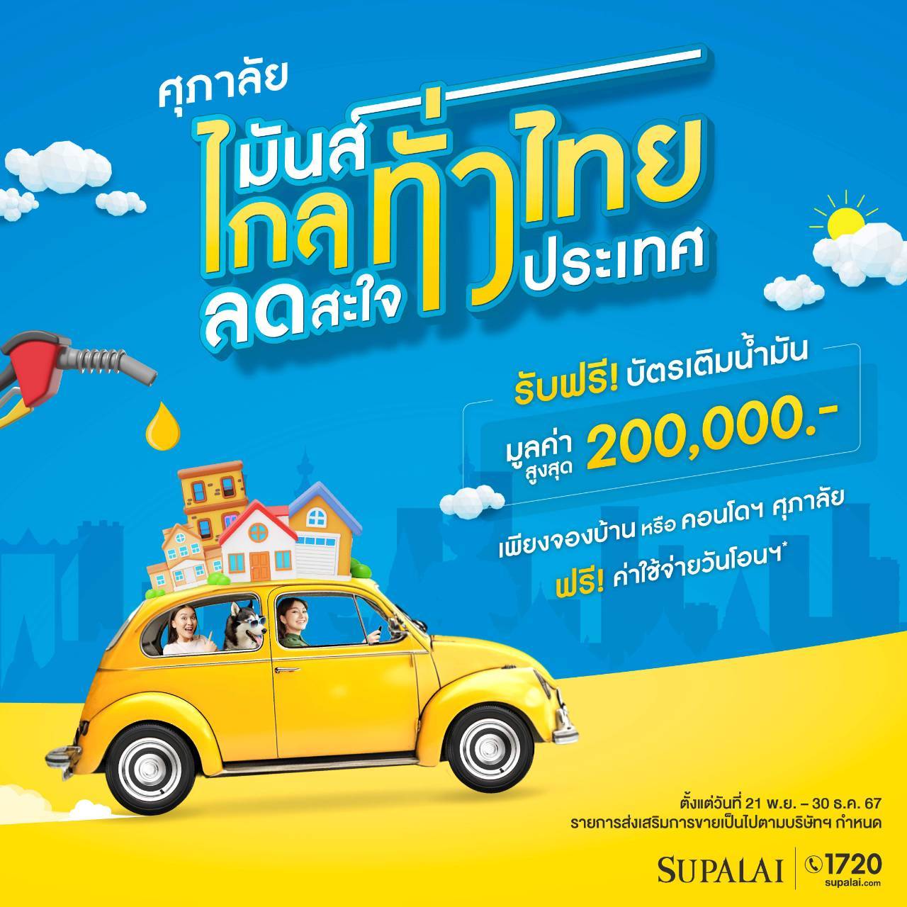 บมจ.ศุภาลัย จัดโปรโมชันส่งท้ายปี 2567 ด้วยแคมเปญ “ศุภาลัย มันส์ไกลทั่วไทย ลดสะใจทั่วประเทศ” สำหรับลูกค้าที่ตัดสินใจจองบ้านเดี่ยว, บ้านแฝด, ทาวน์โฮม, อาคารพาณิชย์ และคอนโดมิเนียม สร้างเสร็จพร้อมโอนฯ* รับฟรี! บัตรเติมน้ำมัน มูลค่าสูงสุด 200,000 บาท เพื่อใช้ในการเดินทางท่องเที่ยวพักผ่อนในจังหวัดต่างๆ ได้อย่างเต็มที่ โดยไม่ต้องกังวลเรื่องค่าใช้จ่ายในการเติมน้ำมัน อีกทั้งยังมอบสิทธิพิเศษอีกมากมาย เริ่มโปรโมชันตั้งแต่วันที่ 21 พฤศจิกายน – 30 ธันวาคม 2567 นี้