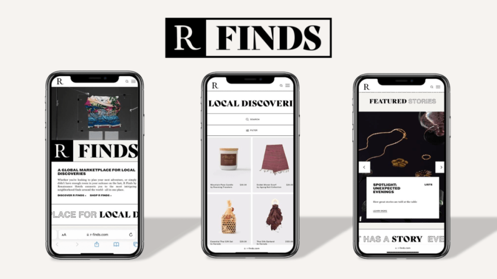 แพลตฟอร์มใหม่นี้ได้รับการคัดสรรโดย Navigators ของเรเนซองส์ ผู้ที่มีความผูกพันอย่างลึกซึ้งกับชุมชน นอกจากจะให้คำแนะนำเกี่ยวกับสถานที่ท่องเที่ยว ร้านอาหาร และกิจกรรมต่างๆ แก่แขกผู้เข้าพักแล้ว Navigators ยังช่วยให้ลูกค้าได้ค้นพบและสนับสนุนธุรกิจสร้างสรรค์ที่ดีที่สุด ซึ่งมักจะเป็นร้านค้าเล็กๆ ที่ซ่อนตัวอยู่ในแต่ละย่าน สินค้าใน R FINDS มีความหลากหลาย ตั้งแต่งานฝีมือ อาหารพื้นเมือง ของตกแต่งบ้าน ไปจนถึงเครื่องประดับ ล้วนได้รับการคัดสรรมาอย่างดีเพื่อสะท้อนจิตวิญญาณอันโดดเด่นของแต่ละชุมชน R FINDS ไม่คิดค่าคอมมิชชั่นจากผู้ขาย จึงเป็นการช่วยเพิ่มโอกาสให้ช่างฝีมือและผู้ประกอบการท้องถิ่นได้เผยแพร่ผลงานสู่สายตาชาวโลกโดยไม่มีค่าใช้จ่าย และเป็นการสนับสนุนธุรกิจขนาดเล็กที่เป็นหัวใจสำคัญของชุมชนเหล่านี้อีกด้วย