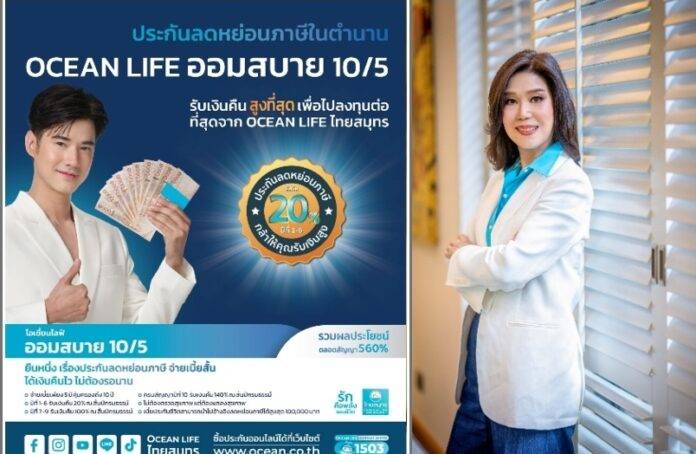 บมจ.ไทยสมุทรประกันชีวิต รักคือพลังของชีวิต โดยคุณนุสรา (อัสสกุล) บัญญัติปิยพจน์ ประธานเจ้าหน้าที่บริหารและกรรมการผู้จัดการ เห็นความสำคัญของการวางแผนลดหย่อนภาษีช่วงปลายปี จึงส่งผลิตภัณฑ์ประกันลดหย่อนภาษี “โอเชี่ยนไลฟ์ ออมสบาย 10/5” ที่ได้รับผลตอบแทนสูงทุกปี ตั้งแต่ปีแรก ณ สิ้นปีกรมธรรม์ที่ 1 – 6 รับเงินคืนปีละ 20% ของจำนวนเงินเอาประกันภัย ณ สิ้นปีกรมธรรม์ที่ 7 – 9 รับเงินคืนปีละ 100% ของจำนวนเงินเอาประกันภัย และ ณ สิ้นปีกรมธรรม์ที่ 10 ครบกำหนดสัญญารับเงินคืน 140% ของจำนวนเงินเอาประกันภัย