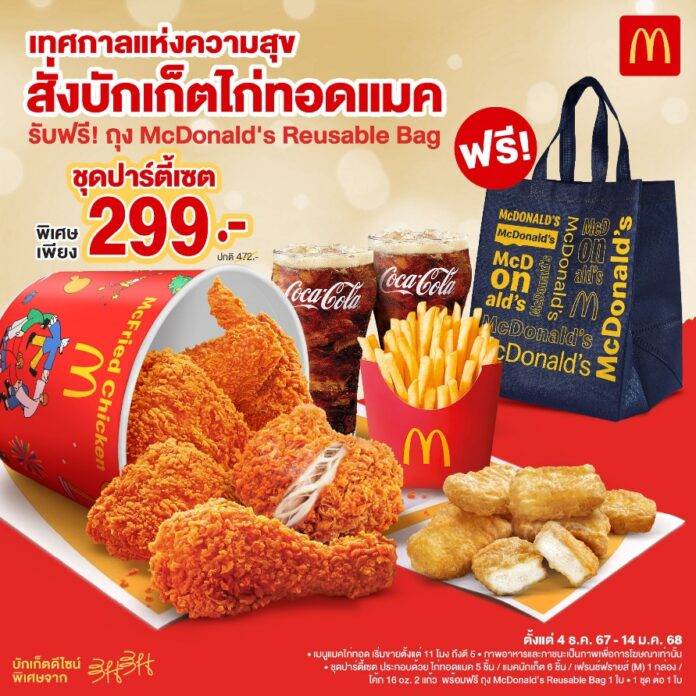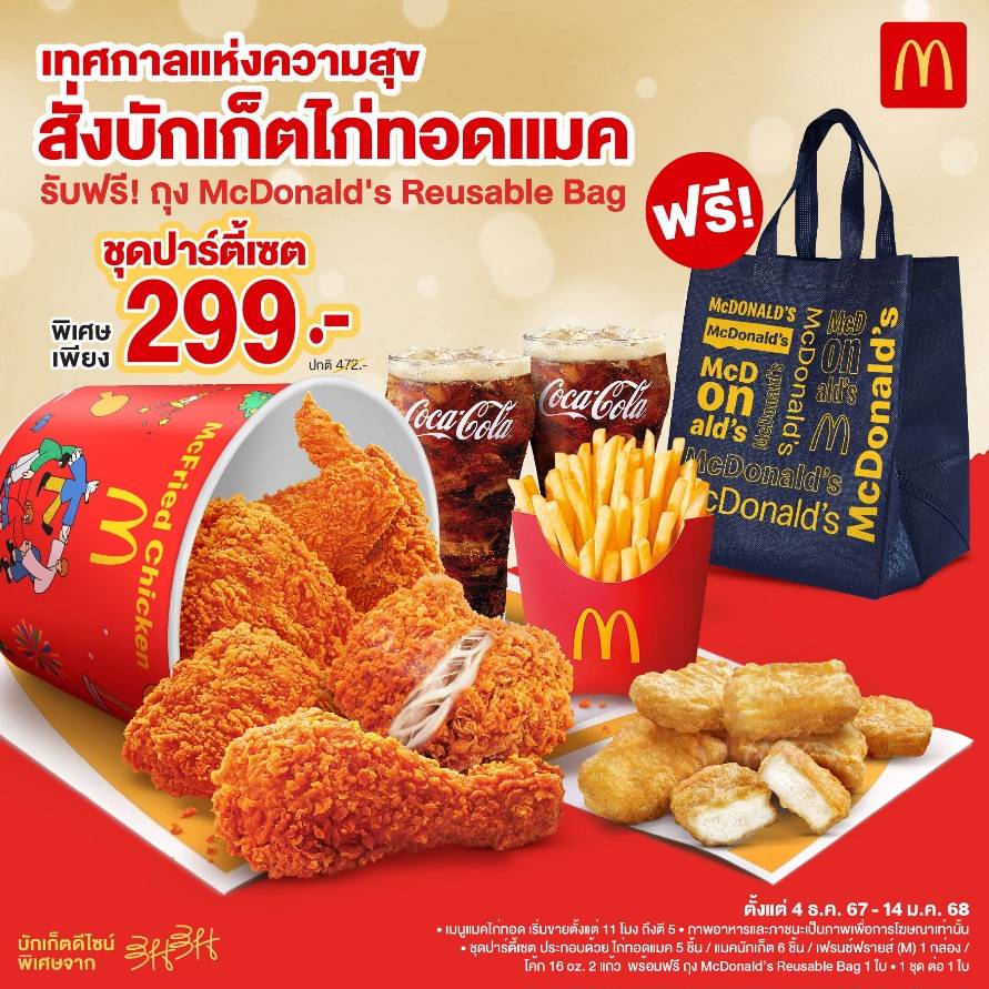 ชุดปาร์ตี้เชตไก่ทอดแมค ราคาเริ่มต้นเพียงชุดละ 299 บาท จัดเต็มความอร่อยสำหรับคนรักไก่ทอดแมค ได้แก่ ไก่ทอดแมค 5 ชิ้น , แมคนักเก็ต 6 ชิ้น, เฟรนช์ฟรายส์ ขนาดกลาง 1 กล่อง , โค้ก ขนาด 16 ออนซ์ 2 แก้ว แถมฟรี! ถุง McDonald’s Reusable Bag มูลค่า 69 บาท จะใช้ช้อปปิ้งของขวัญต้อนรับวันคริสมาสต์หรือวันปีใหม่ก็ปัง!