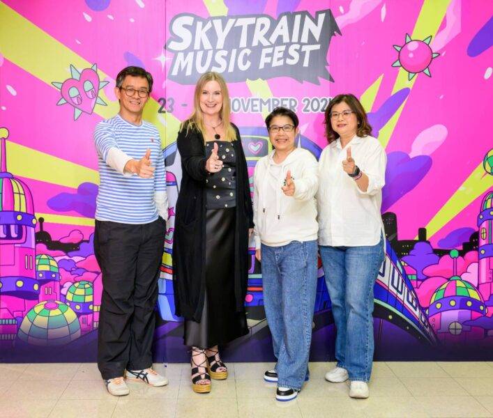 กรุงไทย-แอกซ่า ประกันชีวิต นำโดย คุณแซลลี่ โอฮาร่า ประธานเจ้าหน้าที่บริหาร บริษัท แอกซ่า ในภูมิภาคเอเชียอาคเนย์ และประเทศเกาหลีใต้ (คนที่ 2 จากซ้าย) และคุณบุปผาวดี โอวรารินท์ ประธานเจ้าหน้าที่บริหาร ฝ่ายทรัพยากรมนุษย์และภาพลักษณ์องค์กรและการสื่อสารองค์กร (คนที่ 2 จากขวา) พร้อมคณะผู้บริหารระดับสูง จับมือร่วมกับพันธมิตร VGI , BTS , Goodthings Happen , Zaap Word Entertainment, XOXO Entertainment , LOVEiS ENTERTAINMENT , Warner MusicThailand , Boxx Music และ What The Duck Music และผู้สนับสนุน ยกระดับวัฒนธรรมดนตรีผ่านกิจกรรม ‘SkyTrain Music Fest’ พลิกโฉมขบวนรถไฟฟ้าเป็นคอนเสิร์ตรูปแบบใหม่ครั้งแรกในประเทศไทย ดึงศิลปิน T-Pop ชั้นนำ อาทิ นนท์-ธนนท์, 4EVE, ATLAS, Bowkylion และศิลปินอื่นๆอีกมากมาย มาร่วมสร้างเสียงเพลงบนขบวน BTS เพื่อมอบประสบการณ์ที่สอดคล้องกับไลฟ์สไตล์อันหลากหลายของลูกค้าที่ไม่เหมือนใคร