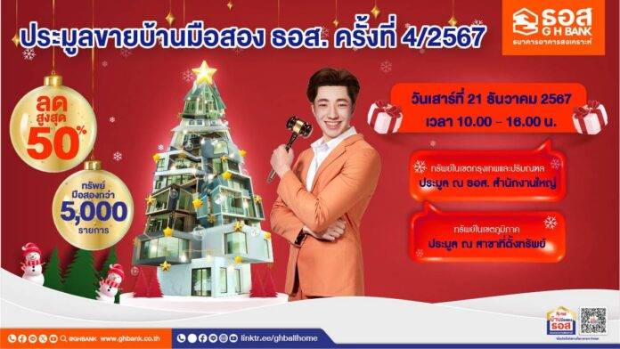 ธนาคารอาคารสงเคราะห์ (ธอส.) สนับสนุนคนไทยมีที่อยู่อาศัยเป็นของตนเองส่งท้ายปี 2567 จัดงานประมูลขายบ้านมือสอง ธอส. ประจำปี ครั้งที่ 4/2567 ในวันเสาร์ที่ 21 ธันวาคม 2567 เวลา 10.00 – 16.00 น. พบกับบ้านมือสอง ธอส. ทำเลดี มากกว่า 8,000 รายการทั่วประเทศ มาประมูลขายในราคาลดพิเศษสูงสุดถึง 50% (เงื่อนไขเป็น