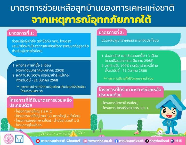การเคหะแห่งชาติออกมาตรการช่วยเหลือชาวชุมชนที่พักอาศัยอยู่ในโครงการของการเคหะแห่งชาติที่ได้รับผลกระทบจากสถานการณ์น้ำท่วมภาคใต้ “พักหนี้ หยุดเก็บค่าเช่า/ลดค่าปรับนาน 3 เดือน” เริ่มตั้งแต่วันที่ 1 มกราคม ถึง 31 มีนาคม 2568