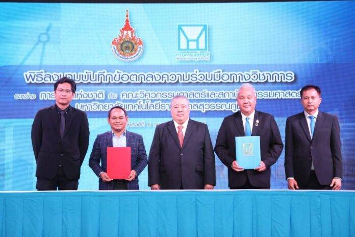 นายอณุศาสณ์ อรรถวิทยา กรรมการการเคหะแห่งชาติ เป็นประธานในพิธีลงนามบันทึกข้อตกลงความร่วมมือวิชาการระหว่างการเคหะแห่งชาติ และคณะวิศวกรรมศาสตร์และสถาปัตยกรรมศาสตร์ มหาวิทยาลัยเทคโนโลยีราชมงคลสุวรรณภูมิ โดยมี นายทวีพงษ์ วิชัยดิษฐ ผู้ว่าการการเคหะแห่งชาติ ผศ. พัชระ กัญจนกาญจน์ คณบดีคณะวิศวกรรมศาสตร์และสถาปัตยกรรมศาสตร์ มหาวิทยาลัยเทคโนโลยีราชมงคลสุวรรณภูมิ ร่วมลงนามดังกล่าว พร้อมด้วย ผศ.ดร.อำนาจ จำรัสจรุงผล กรรมการการเคหะแห่งชาติ ผู้บริหารและผู้ปฏิบัติงานการเคหะแห่งชาติ เข้าร่วมเป็นเกียรติในงาน เพื่อผนึกความร่วมมือทางวิชาการด้านที่อยู่อาศัย และฝึกประสบการณ์วิชาชีพให้กับนิสิตมหาวิทยาลัยและบุคลากรของการเคหะแห่งชาติ เมื่อวันที่ 6 มกราคม 2568 ณ สำนักงานใหญ่ การเคหะแห่งชาติ ถนนนวมินทร์