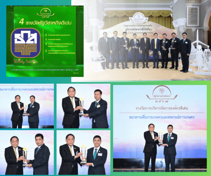 ธ.ก.ส. คว้า 4 รางวัลรัฐวิสาหกิจดีเด่น ประจำปี 2567 (SOE Awards) จัดโดยสำนักงานคณะกรรมการนโยบายรัฐวิสาหกิจ (สคร.) ได้แก่ รางวัลบริหารจัดการองค์กรดีเด่น รางวัลการดำเนินงานอย่างรับผิดชอบต่อสังคมและสิ่งแวดล้อมดีเด่น รางวัลบริการดีเด่น และรางวัลความคิดสร้างสรรค์และนวัตกรรมดีเด่น ด้านความคิดสร้างสรรค์ สะท้อนถึงความสำเร็จในการดำเนินงานของ ธ.ก.ส. ในการขับเคลื่อนภารกิจตามกรอบนโยบายและยุทธศาสตร์ธนาคาร มุ่งพัฒนาองค์กรในทุกมิติ เพื่อมุ่งสู่การเป็น “ธนาคารพัฒนาชนบทที่ยั่งยืน”
