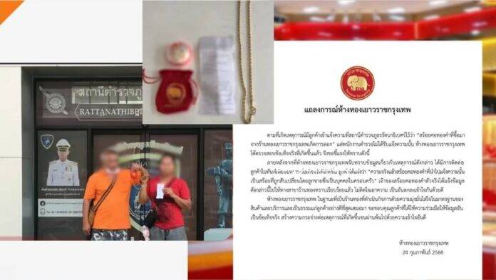 ขอชี้แจงดังนี้ : หลังจากที่ทางห้างทองได้รับทราบข้อมูลเกี่ยวกับเหตุการณ์ดังกล่าว ได้มีการติดต่อลูกค้าเพื่อตรวจสอบข้อเท็จจริงเพิ่มเติม โดยลูกค้าได้แจ้งว่า ความจริงแล้วสร้อยคอทองคำที่นำมาแจ้งความนั้น เป็นสร้อยที่แอบถูกเปลี่ยนโดยลูกชายในครอบครัว และลูกค้าได้แจ้งมาทางร้านทองเรียบร้อยแล้ว ห้างทองเยาวราชกรุงเทพในฐานะร้านทองที่ดำเนินกิจการด้วยความมุ่งมั่นใส่ใจในมาตรฐานของสินค้าและบริการและเป็นธรรมแก่ลูกค้าอย่างดีที่สุดเสมอมา เราจะดำเนินการตรวจสอบและดูแลเรื่องนี้อย่างรอบคอบ ขอขอบคุณลูกค้าที่ให้ความร่วมมือในการชี้แจงข้อเท็จจริง