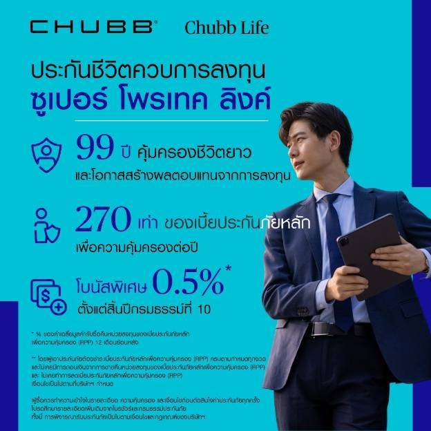 สำหรับผู้ที่สนใจผลิตภัณฑ์ประกันชีวิตควบการลงทุน “ซูเปอร์ โพรเทค ลิงค์” จาก ชับบ์ ไลฟ์ ประกันชีวิต สามารถดูรายละเอียดเพิ่มเติมได้ที่ https://www.chubb.com/th-th/personal/unit-linked.html หรือติดต่อตัวแทนฯ ชับบ์ ไลฟ์ ประกันชีวิต ทั่วประเทศ