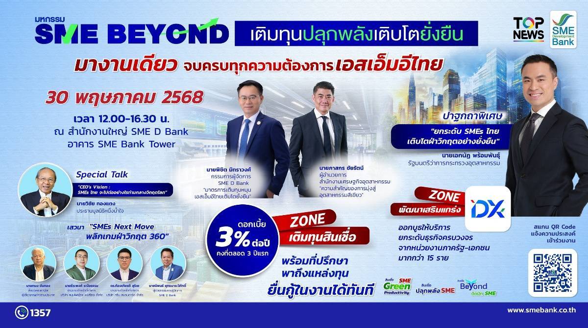 SME D Bank เตรียมจัดงานใหญ่ “มหกรรม SME BEYOND เติมทุนปลุกพลังเติบโตยั่งยืน” วันที่ 30 พฤษภาคม 2568 นี้ ณ สำนักงานใหญ่ SME D Bank เวลา 12.00-16.30 น. รวบรวมการสนับสนุนเอสเอ็มอีไทยอย่างครบถ้วนมาไว้ในงานเดียว ทั้งสินเชื่อดอกเบี้ยพิเศษเพียง 3% ต่อปี เน้นสนับสนุนลงทุนติดตั้งโซลาร์เซลล์ ช่วยลดต้นทุนพลังงาน และเติมเสริมสภาพคล่อง ยื่นกู้ได้ทันที เวทีเสวนาอัปเดตสถานการณ์เศรษฐกิจจากกูรูระดับประเทศ บริการเสริมแกร่งธุรกิจครบวงจร และการออกบูธจากหน่วยงานภาครัฐและเอกชน เปิดโอกาสเชื่อมโยงขยายเครือข่ายธุรกิจ ด่วน! แจ้งความประสงค์เข้าร่วม ฟรี!!