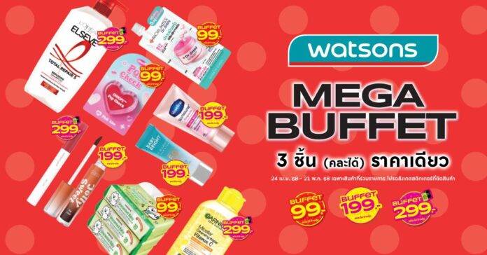 Watsons Mega Buffet ชวนทุกคนมามิกซ์แอนด์แมทช์สินค้าที่ใช่ จำนวน 3 ชิ้นคละได้ในราคาเดียว เฉพาะสินค้าที่ร่วมรายการ เริ่มต้นที่ 99 บาท และ 199 บาท สำหรับสมาชิกวัตสันคลับ เอนจอยชอปปิงได้ตั้งแต่ 22 เมษายน – 21 พฤษภาคม 2568 ที่ร้านวัตสันทุกสาขาทั่วประเทศ และทางวัตสันออนไลน์ ติดตามรายละเอียดเพิ่มเติมได้ที่สื่อประชาสัมพันธ์ ณ จุดขาย หรือ Line Official @WatsonsTH, เว็บไซต์ Watsons.co.th หรือผ่านแอป WatsonsTH ดาวน์โหลดได้ที่ Google Play Store และ App Store