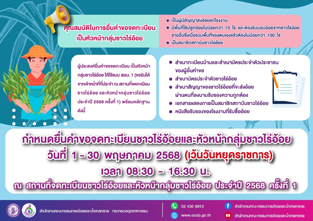 เพื่อมอบสิทธิประโยชน์ดี ๆ ให้กับเกษตรกรชาวไร่อ้อย ถึงวันที่ 31 พฤษภาคม 2568 (เว้นวันหยุดราชการ) ระหว่างเวลา 08.30 – 16.30 น. โดยสามารถยื่นคำร้องขอจดทะเบียนได้ที่เขตบริหารอ้อยและน้ำตาลทราย 1 – 8 หน่วยประจำโรงงานน้ำตาลทั้ง 58 แห่ง และสมาคมชาวไร่อ้อย 39 แห่งทั่วประเทศ ไม่เสียค่าธรรมเนียมใด ๆ ทั้งสิ้น
