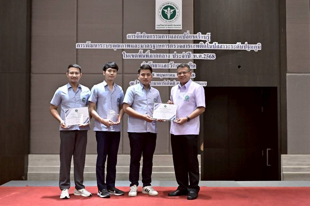 “การสัมมนาแลกเปลี่ยนเรียนรู้ในครั้งนี้ มีศูนย์คัดกรองในเขตพื้นที่ภาคกลาง เขตสุขภาพที่ 4, 5, 6 และ 13 เข้าร่วมแลกเปลี่ยนเรียนรู้การการดำเนินงาน ซึ่งจะช่วยให้การตรวจสารเสพติดในปัสสาวะ ของหน่วยตรวจระดับปฐมภูมิ มีประสิทธิภาพยิ่งขึ้น และสนับสนุนการดำเนินการด้านการบำบัดรักษาและฟื้นฟูผู้ติดยาเสพติดต่อไป นอกจากนี้ภายในงานยังมีการมอบประกาศนียบัตรแก่ศูนย์คัดกรองที่มาร่วมแลกเปลี่ยนประสบการณ์ และโล่ประกาศเกียรติคุณสำหรับหน่วยงานที่มีผลการดำเนินงานดีเด่นจากกรมวิทยาศาสตร์การแพทย์อีกด้วย โดยการสัมมนาในครั้งนี้จัดขึ้นเมื่อวันที่ 8 พฤษภาคม 2568 ณ โรงแรมรามาการ์เดนส์ โดยมีบุคลากรที่เกี่ยวข้องด้านการตรวจสารเสพติดในปัสสาวะระดับปฐมภูมิ ในเขตพื้นที่ภาคกลาง เข้าร่วมสัมมนาจำนวนประมาณ 110 คน”