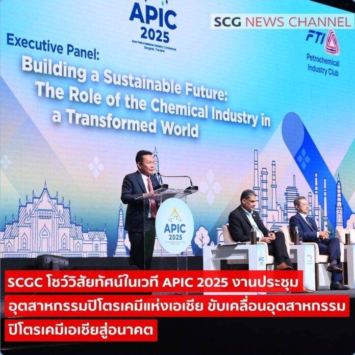 เอสซีจี เคมิคอลส์ หรือ SCGC ผู้นำธุรกิจพอลิเมอร์ และโซลูชันครบวงจรเพื่อความยั่งยืน โดยนายศักดิ์ชัย ปฏิภาณปรีชาวุฒิ ประธานเจ้าหน้าที่บริหารและกรรมการผู้จัดการใหญ่ บริษัท เอสซีจี เคมิคอลส์ จำกัด (มหาชน) ร่วมแสดงวิสัยทัศน์เรื่อง “Building a Sustainable Future: The Role of the Chemical Industry in a Transformed World หรือ สร้างอนาคตที่ยั่งยืน : บทบาทของอุตสาหกรรมเคมีในโลกที่เปลี่ยนแปลง” ในการประชุมอุตสาหกรรมปิโตรเคมีแห่งเอเชีย 2025 หรือ Asia Petrochemical Industry Conference 2025 (APIC 2025) ภายใต้แนวคิด “Ensuring a Transformed World Prosperity” สะท้อนถึงบทบาทสำคัญของอุตสาหกรรมปิโตรเคมี ต่อการขับเคลื่อนการเติบโตทางเศรษฐกิจ ยกระดับคุณภาพชีวิต และส่งเสริมความยั่งยืนในอนาคต จัดโดยกลุ่มอุตสาหกรรมปิโตรเคมี สภาอุตสาหกรรมแห่งประเทศไทย ระหว่างวันที่ 15-16 พฤษภาคม 2568 ณ โรงแรมเซ็นทาราแกรนด์ แอท เซ็นทรัลเวิลด์ โดยมีผู้ร่วมงานจากอุตสาหกรรมปิโตรเคมี ในเอเชียและทั่วโลกกว่า 1,500 คน ภายในงาน SCGC ได้จัดแสดงนวัตกรรม โซลูชัน และเทคโนโลยีเพื่อสร้างโลกที่ดียิ่งกว่า ภายใต้แนวคิด “ProsperWorld” ขับเคลื่อนความยั่งยืนและพัฒนาทุกมิติ ด้วยแนวทาง Low Waste และ Low Carbon