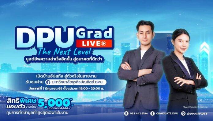 มหาวิทยาลัยธุรกิจบัณฑิตย์ (DPU) เตรียมจัดงาน มหกรรมการศึกษาต่อระดับปริญญาโท-เอก “DPU Grad The Next Level : บูสต์อัพความสำเร็จอีกขั้น สู่อนาคตที่ดีกว่า” ในรูปแบบไลฟ์สด ผ่าน Facebook : มหาวิทยาลัยธุรกิจบัณฑิตย์ DPU ในวันเสาร์ที่ 7 มิถุนายน 2568 เวลา 18.00 – 20.00 น. เพื่อสอดรับกับวิสัยทัศน์ของมหาวิทยาลัยในการพัฒนาบุคลากรที่มีศักยภาพ สู่การเติบโตสูงสุดในสายอาชีพ กับหลักสูตรระดับปริญญาโท-เอก กว่า 30 หลักสูตร ซึ่งการศึกษาต่อจะช่วยให้ผู้เรียน ‘บูสต์อัพ’ ทักษะเดิม และต่อยอดสู่เส้นทางอาชีพที่มั่นคง ก้าวทันการเปลี่ยนแปลงของอาชีพยุคใหม่ พร้อมแนะแนวการศึกษาต่อกับรุ่นพี่ตรงสาย และอาจารย์ประจำหลักสูตร